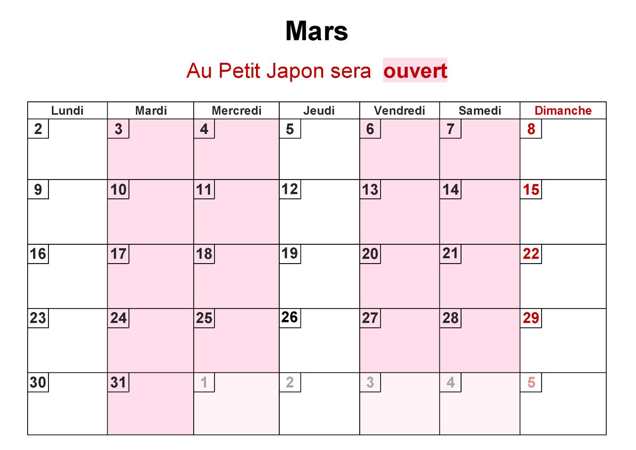 Voici le calendrier du mois.